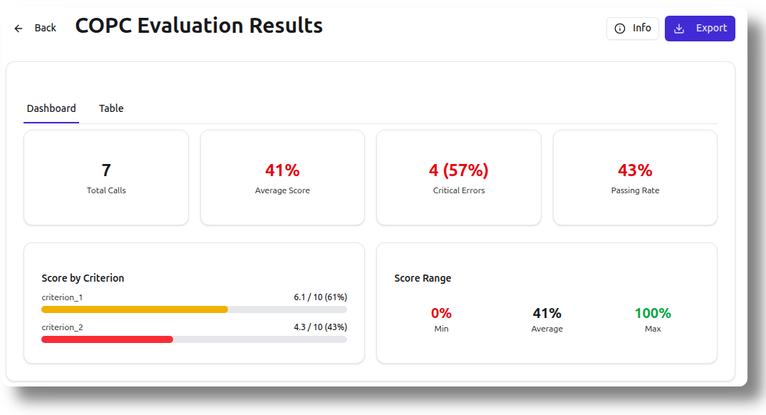 View aggregate KPIs including average scores, passing rates, critical error counts, and per-criterion breakdowns across all evaluated calls