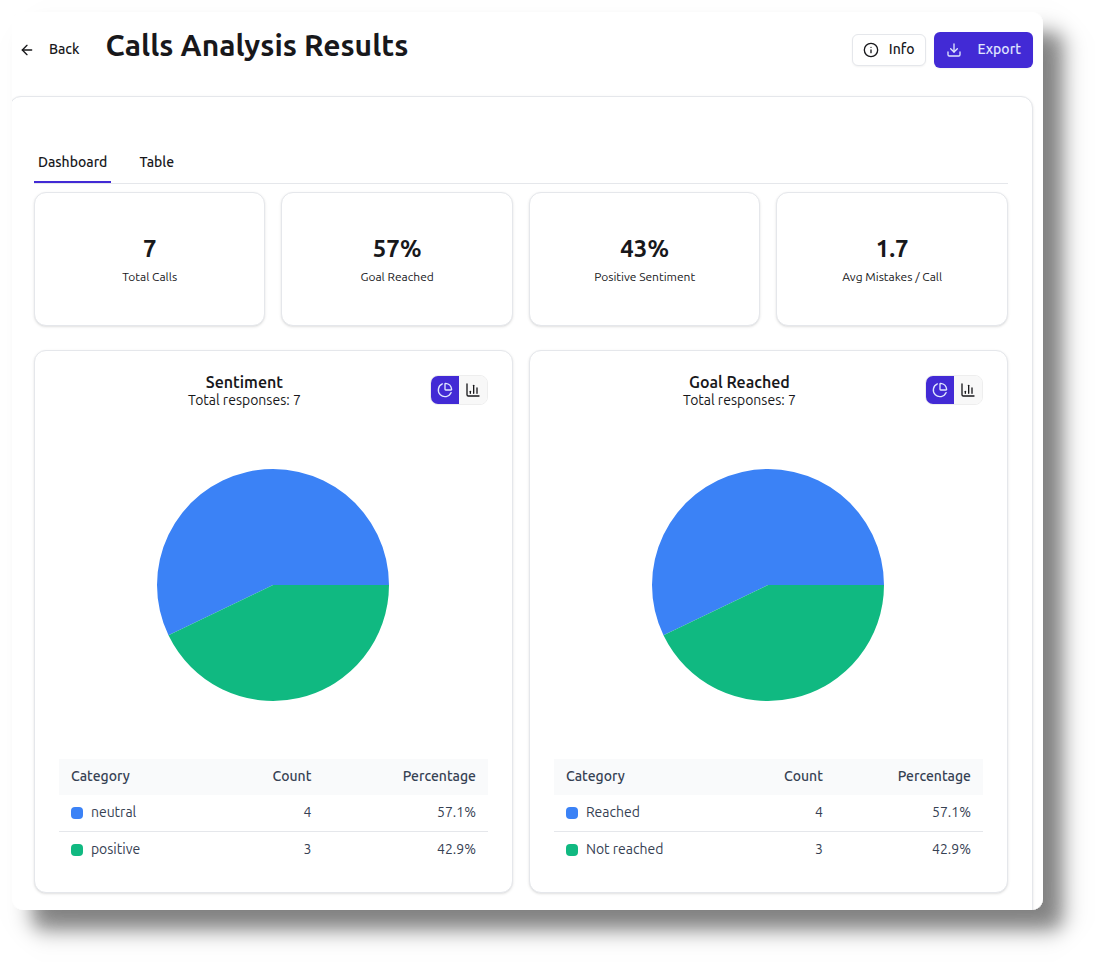 View results in an interactive dashboard with KPI cards, criterion bar charts, and expandable call details. Export to Excel for deeper analysis or PowerPoint for stakeholder presentations.