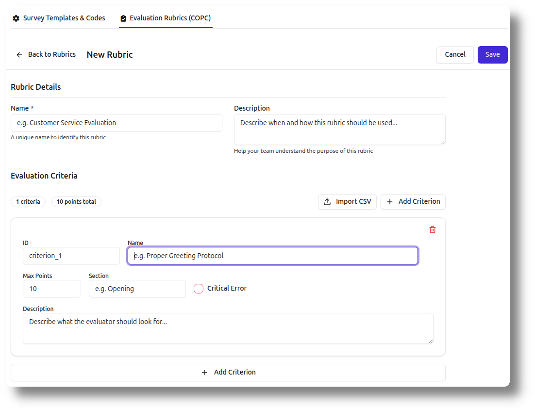Create custom rubrics with weighted criteria, sections, and critical error flags. Import criteria from CSV or build them in the visual editor