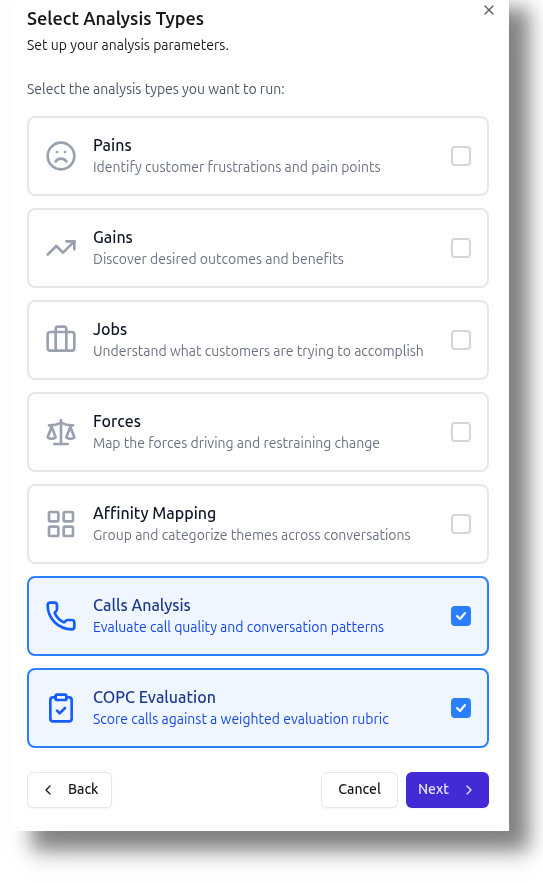 Select your calls, choose COPC Evaluation or Calls Analysis, and pick your rubric. The AI evaluates each call against every criterion with supporting evidence from the transcript.