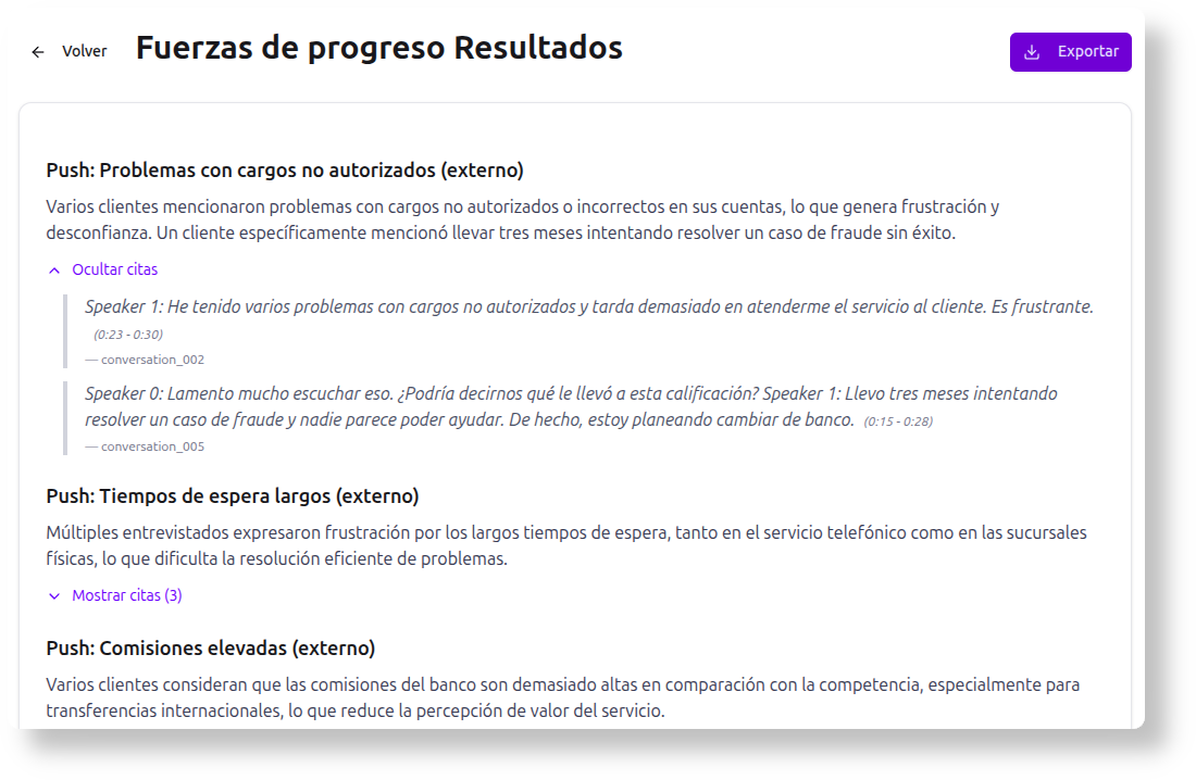 Recibe hallazgos categorizados con citas directas, indicadores de frecuencia e informes exportables—listos para presentaciones a stakeholders o análisis profundo.