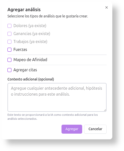 Elige entre frameworks integrados como JTBD, Forces of Progress, extracción de Puntos de Dolor, o crea preguntas de análisis personalizadas adaptadas a tu investigación.